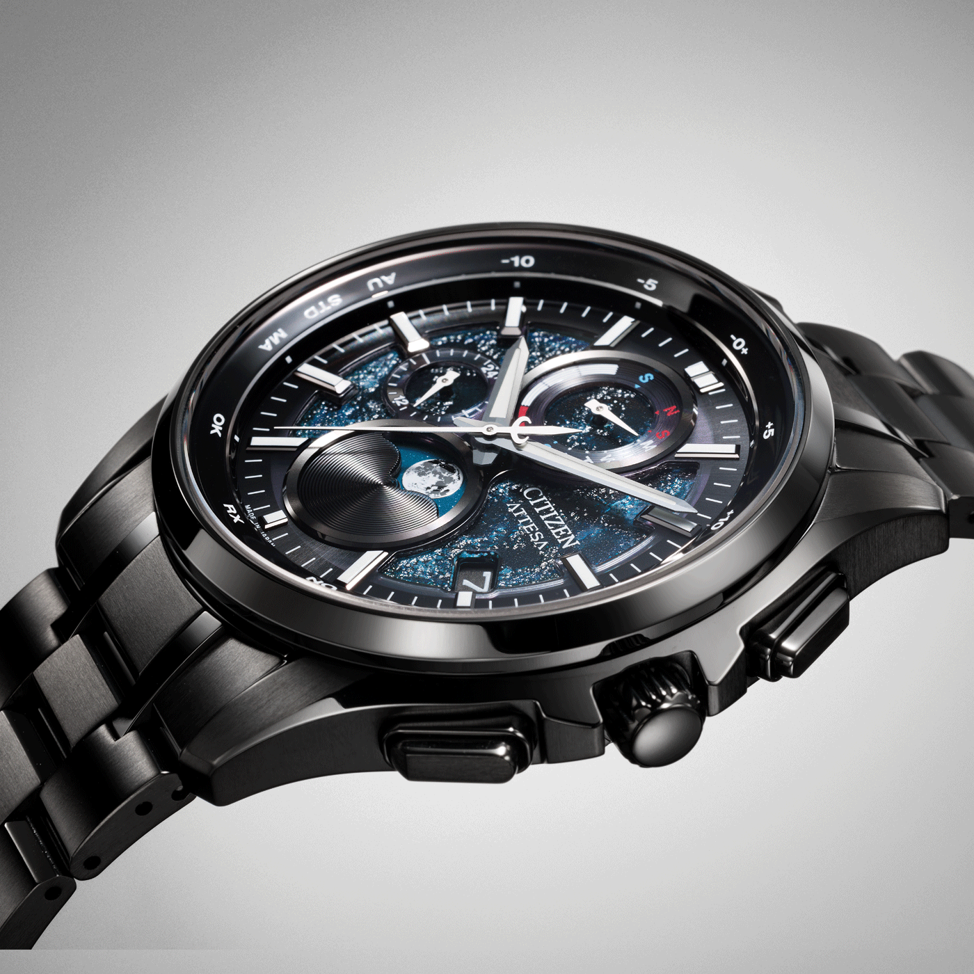 ISO-certified professional diver's watch BJ8055-04E from the PROMASTER Marine collection. With black anti-magnetic stainless steel case, blue natural rubber strap, crystal glass and black dial with illuminated hands and indexes. The crown and case back are screw-down, the bezel can only be rotated on one side. Equipped with caliber B873 with Eco-Drive light movement, date display and 30 bar water resistance. Case diameter: 48.2 mm, strap lug width: 32 mm (integrated).
