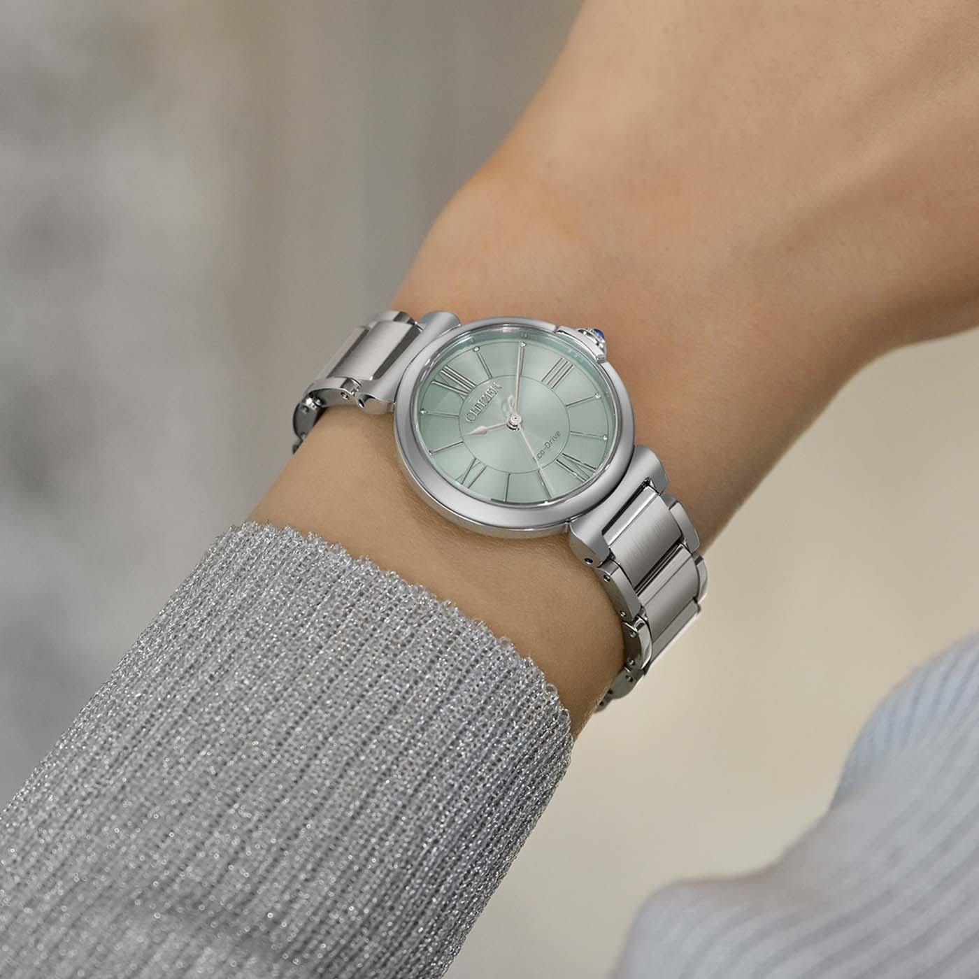 The silver-coloured stainless steel case, measuring around 29.5 mm in diameter and 8.33 mm in height, together with the scratch-resistant sapphire glass, ensures durability and a premium aesthetic. The light pink mother-of-pearl dial features Roman numerals and stick indices, which, together with the solid silver-coloured stainless steel bracelet, creates a balanced overall look.